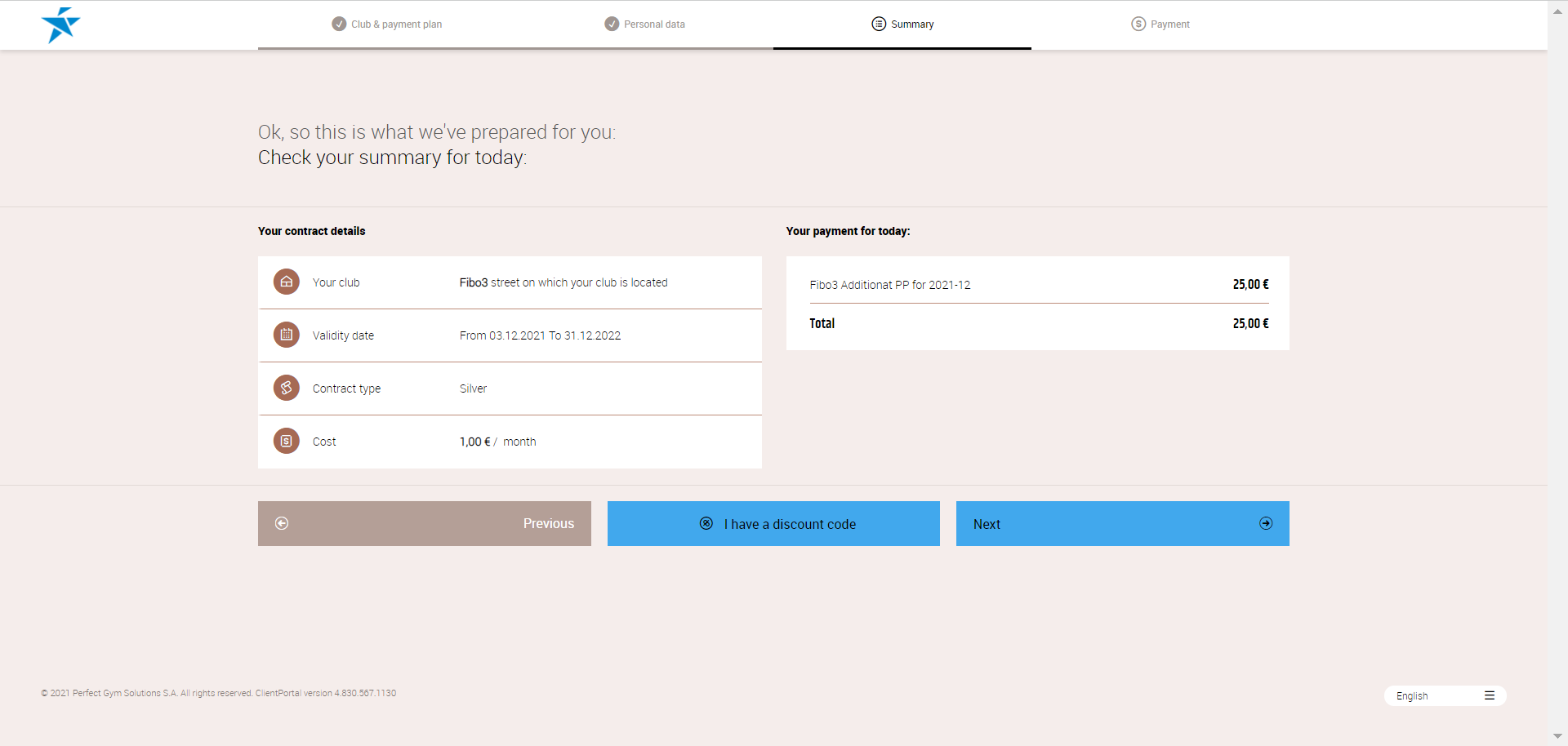 The Summary screen is displayed just before the Payment Gateway step, if such a step has been previously configured. On this screen, your customer will make the final confirmation and their account will be created in the PGM system.