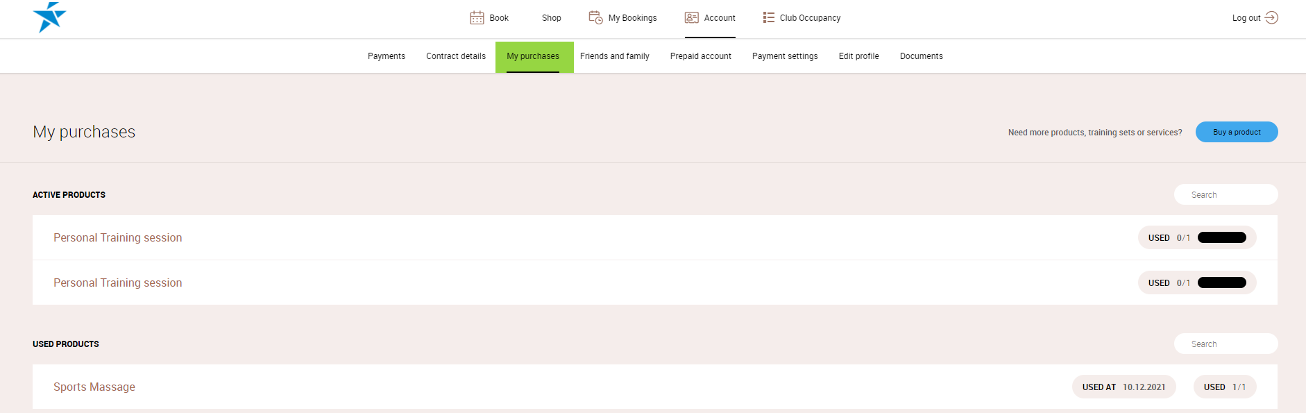 - My Purchases - under this tab, the club members will be able to see the purchased Products and the Product that they have already used. From this tab, they will be able to go directly to the Shop tab by clicking on the Buy a product button.