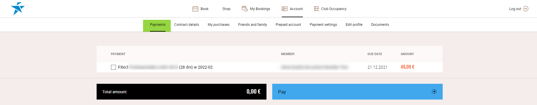 - Payments - under this tab, the club members will be able to pay for their Contract
