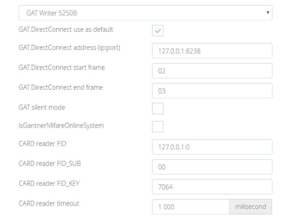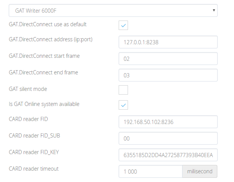 - CARD reader FID - IP komputera, na którym działa serwer GAT Relaxx (system szafek online), port po dwukropku to 8236.
