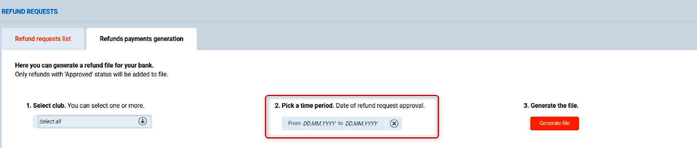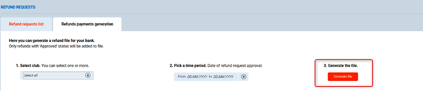 This tab allows you to generate the Refund Payment File which has to be downloaded and sent to the Bank for further acceptance and payment processing.