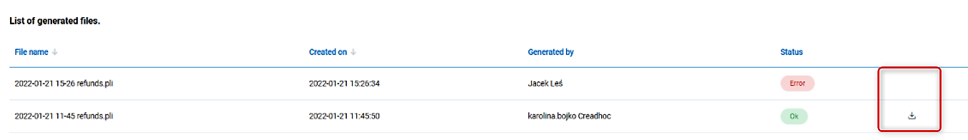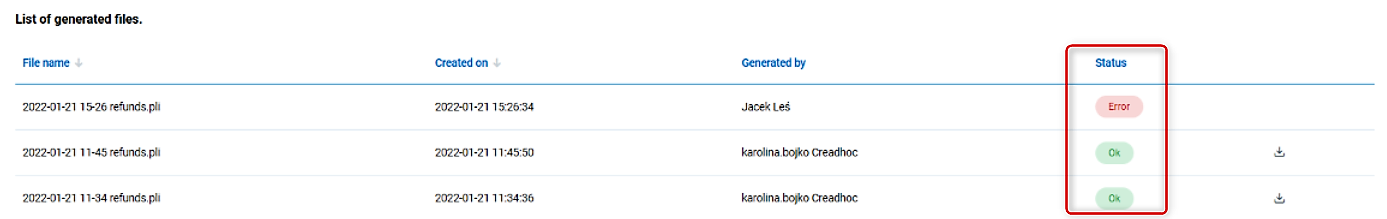 A List of generated files will be displayed. You will see the file name, the file creation date, the person who has created the file and its Status - which informs if the file generation process has ended with Error or if it was successful - OK.