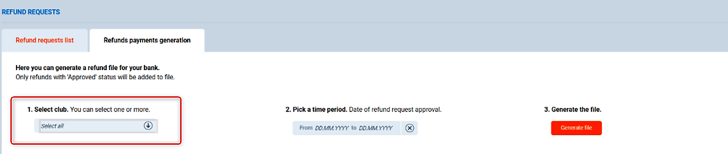 This process allows you to select the Club you want to take into account when generating the file. You can select only one, few, or all clubs listed.