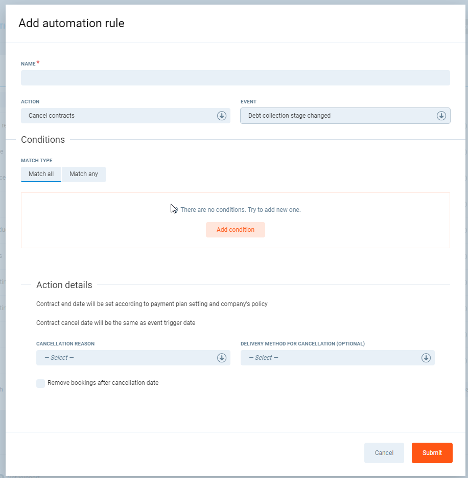 In Automation, Cancel contracts action is designed to be used within the Debt Collection process.