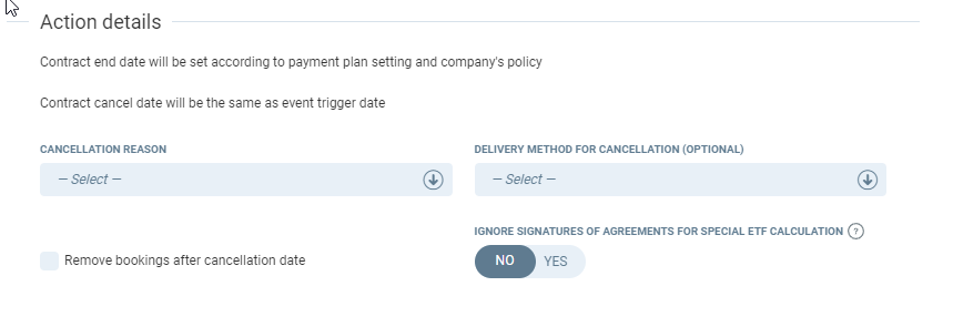 Contracts will be ended with cancel date equals date when task was triggered. Cancel reason and delivery method can be configured in Automation rule: