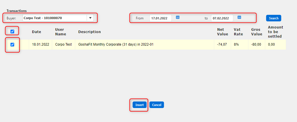 4. Find the corporate customers, select the date range and press Search.