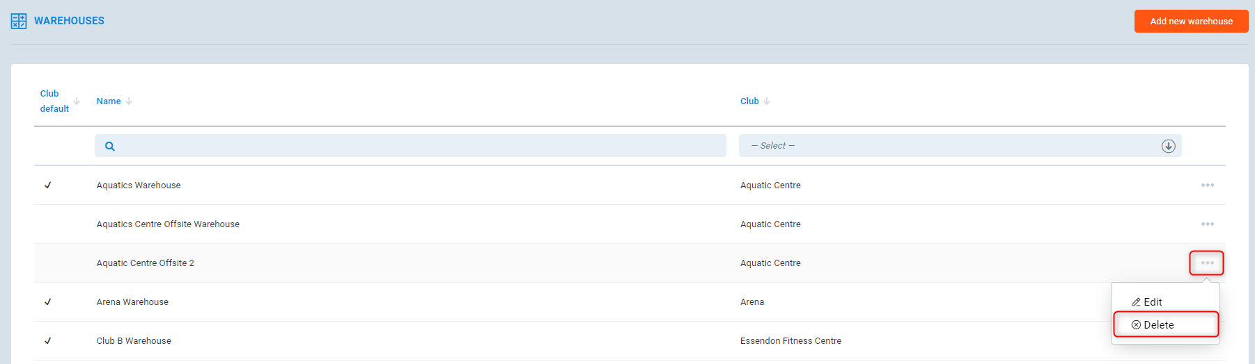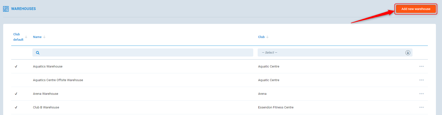 Add new warehouse - Pressing this button will allow you to create a new warehouse for a club.