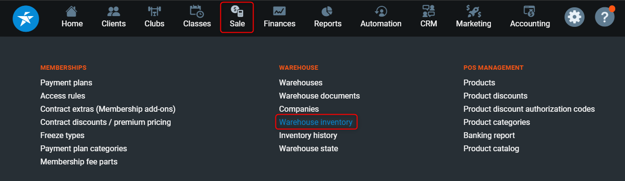 To manage stock and/or perform a stocktake, go to PGM -> Sale -> Warehouse -> Warehouse Inventory.