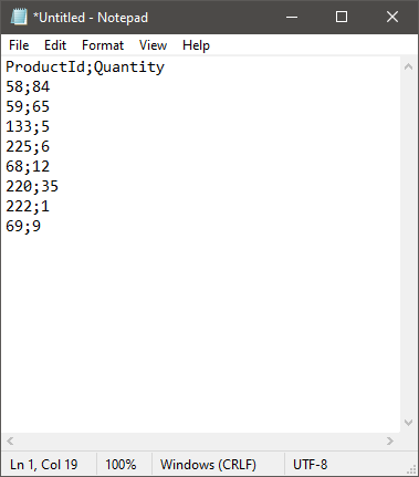Your CSV file must be semi-colon (;) delimited and contain two columns with the exact headers: ProductId and Quantity.