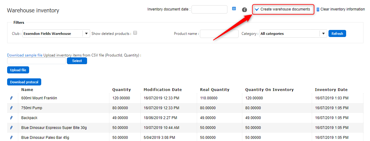 The Warehouse Inventory screen will allow a club to manage stock levels and perform a stocktake.