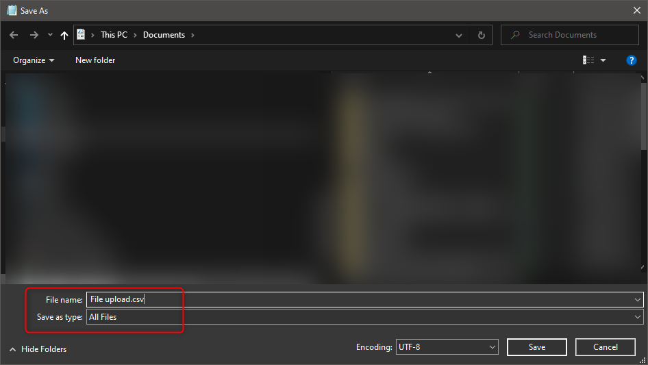 When saving this document, ensure you save it with the file extension .csv and 'save as type' as 'All Files'.