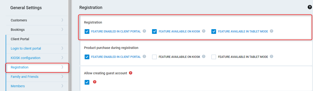 - Then go to Registration and select which application (Client Portal, Tablet, Kiosk) allows registration.
