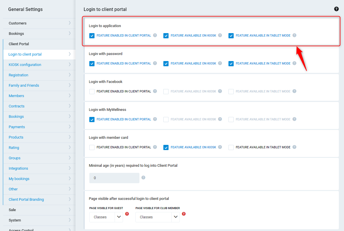 To display or remove the login page for club members to log into the portal go to PGM -> Settings -> System Settings. Then on the left menu tab press Client Portal then Login to Client Portal. The setting 'Login to application' controls if the login section will be visible or not. This can be controlled by the application type (Client portal, Tablet, Kiosk).