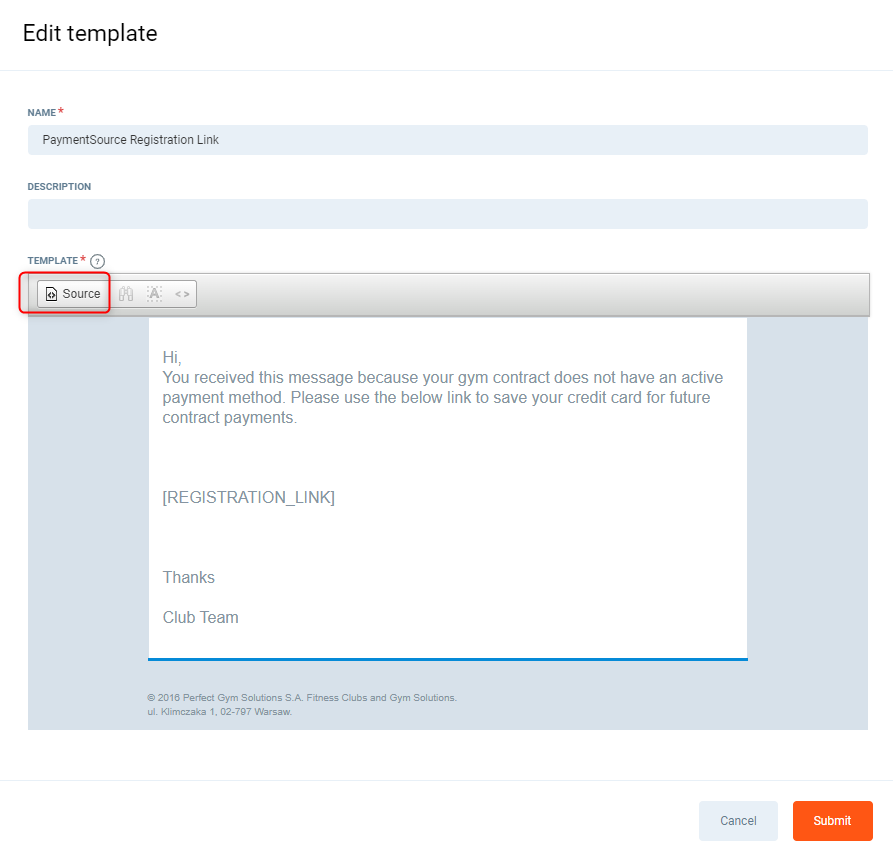 Basic template includes a short message, which is editable content and [PAYMENT_LINK] which will be replaced with hyperlink when message is generated. To edit whole template select Source