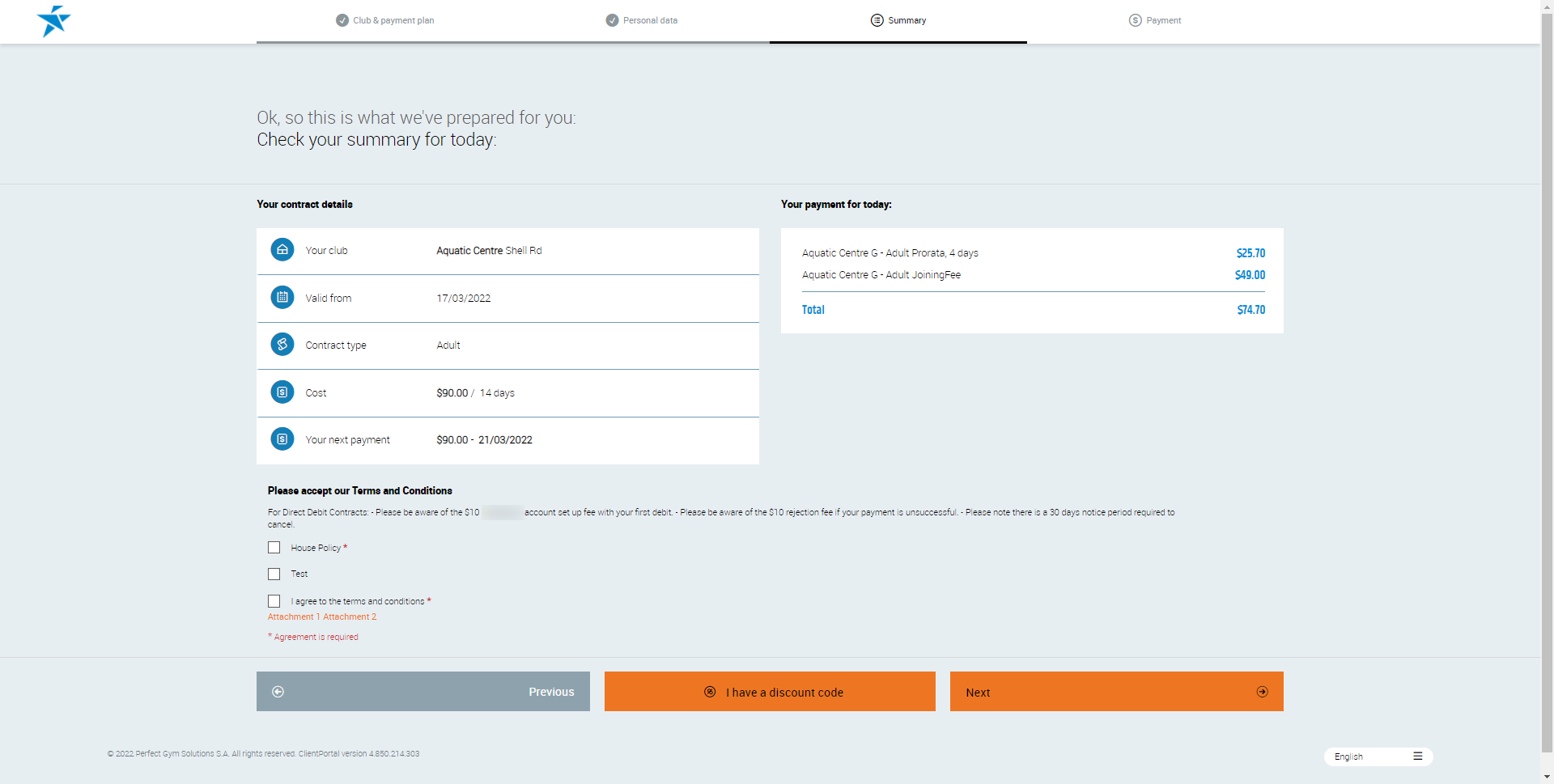 - This will display the contract summary page if a club member is signing up for a contract.