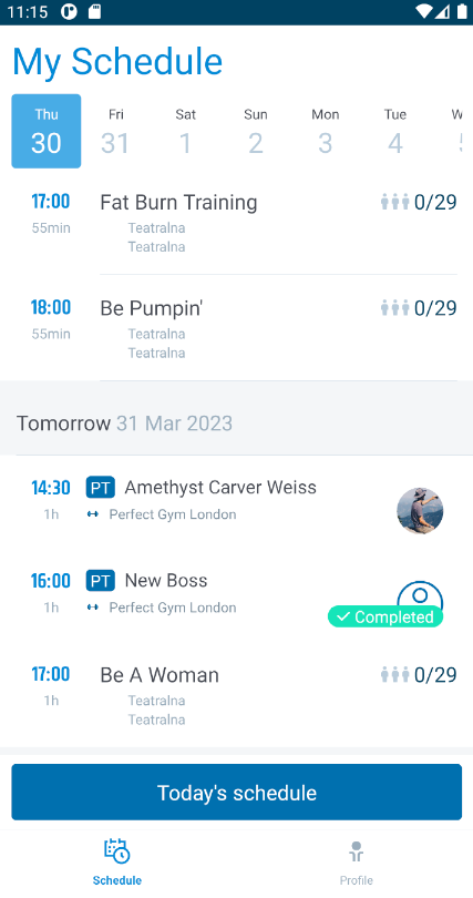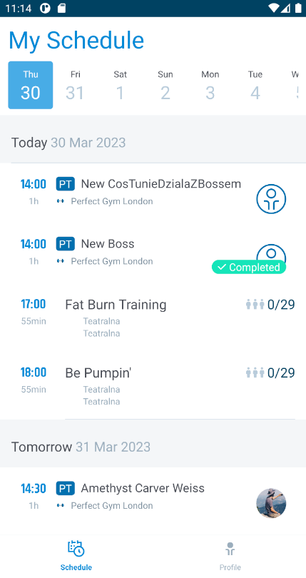 This internal article describes in general how the Calendar tab in the Perfect Gym Pro App works. The Calendar tab is available for the logged users with the linked PGM Trainer account.