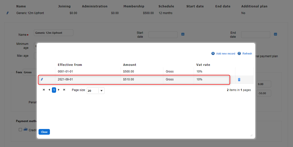 In this example, we have the payment plan "Generic Fortnightly" having a price increase on 01/09/2021 from $40.00 to $41.00.