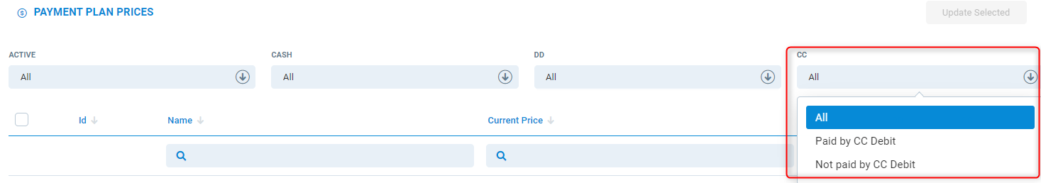 CC - Choose the payment plans between All, Paid by CC Debit or Not paid by CC Debit.