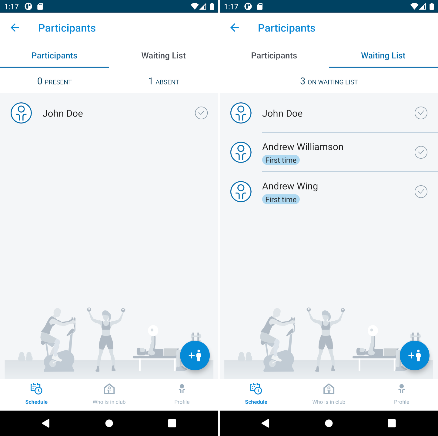 Participants screen shows people who signed up for the given class. Bookings are divided into two parts: regular list and waiting list. Class participants on regular list are sorted alphabetically while those on waiting list are sorted according to their position on list. Picture is shown only if participant gave proper permission.