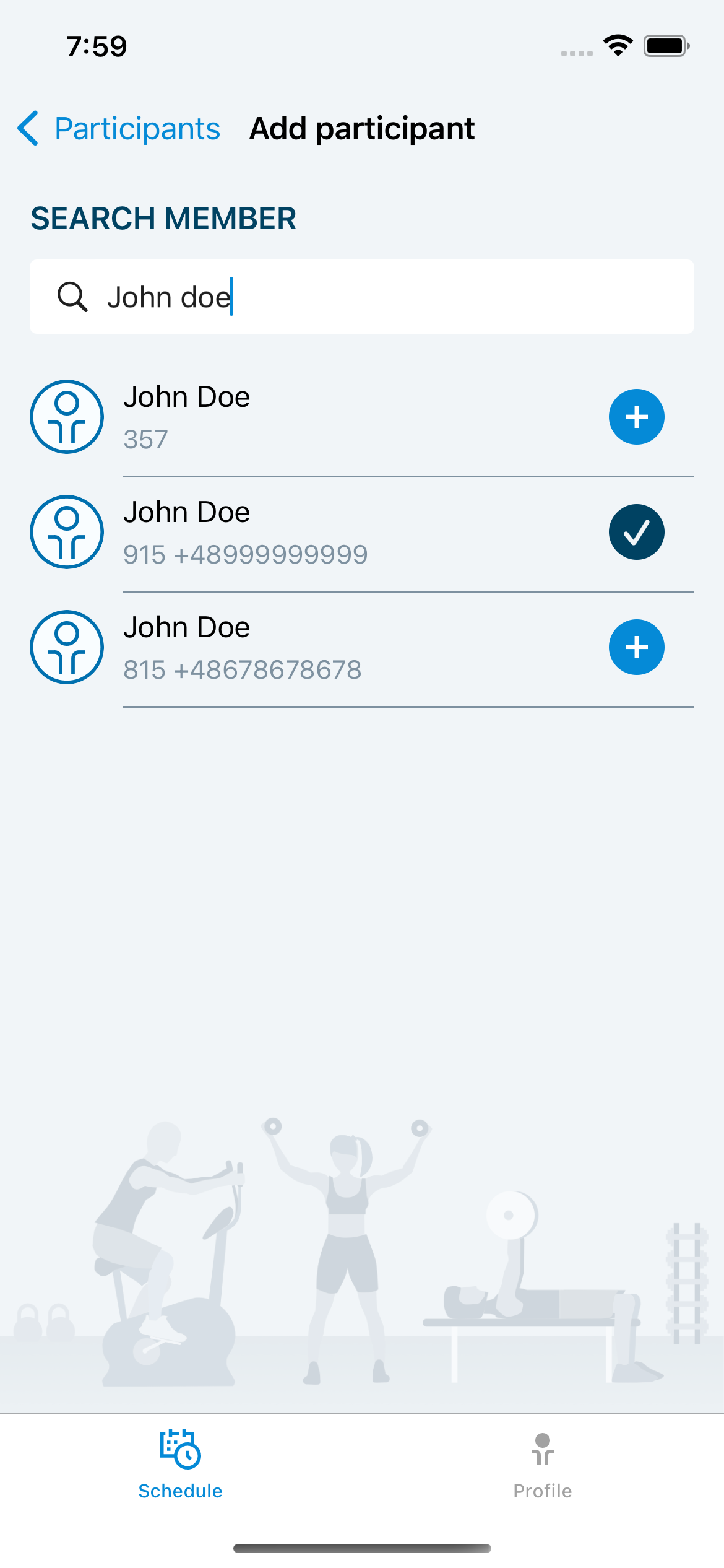 On Add Participants screen you can search member to add it to the class. Searching will start after typing 3 or more characters into search field.