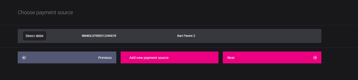 - Select payment source - credit card, direct debit or payment gateway - optional.