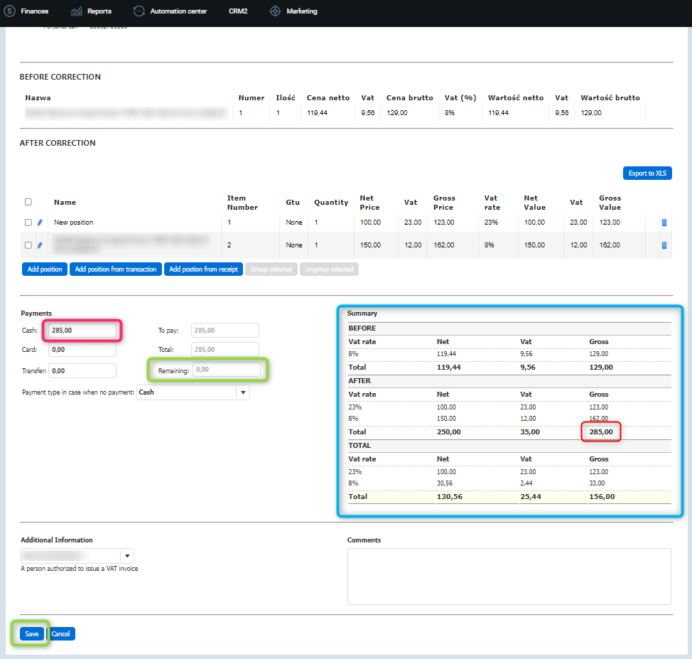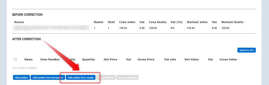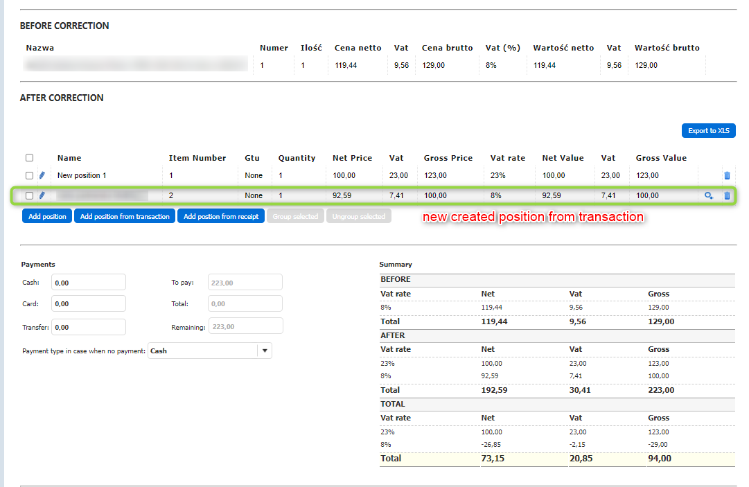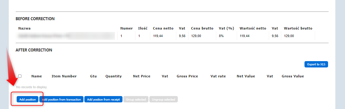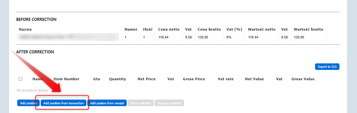 If the company invoice has been marked as paid then the "after correction" positions should be added through the "Add position" button instead of "Add position from the transaction" if related contract transactions have not been edited and adjusted to the correct values.