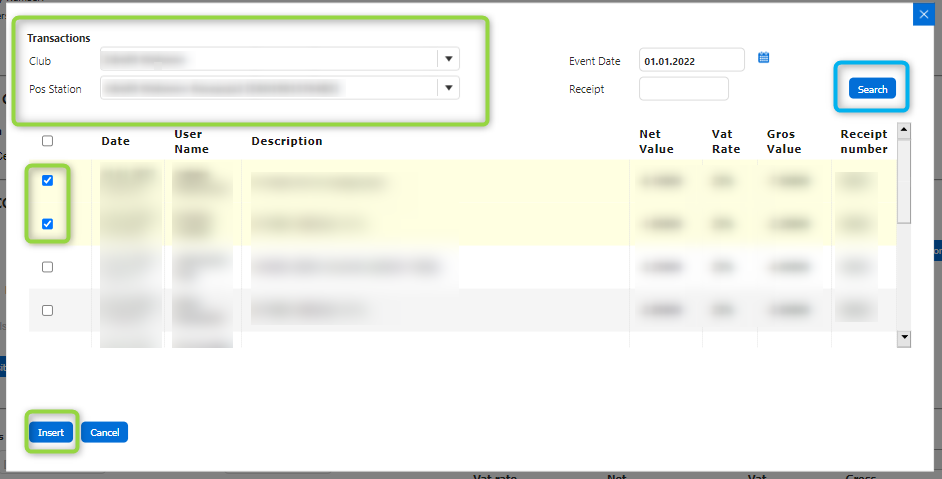 - You will see new window that you are able to find out specific user that have some transactions assigned. When found user has processed transactions than select at least one and click insert.