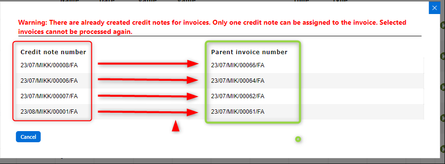Selected invoices with existing credit notes will be shown on the information modal that are not able to be created for current invoice. Only one credit note for invoice. There is a possibility to create credit note for existing credit note (but not for the parent invoice).