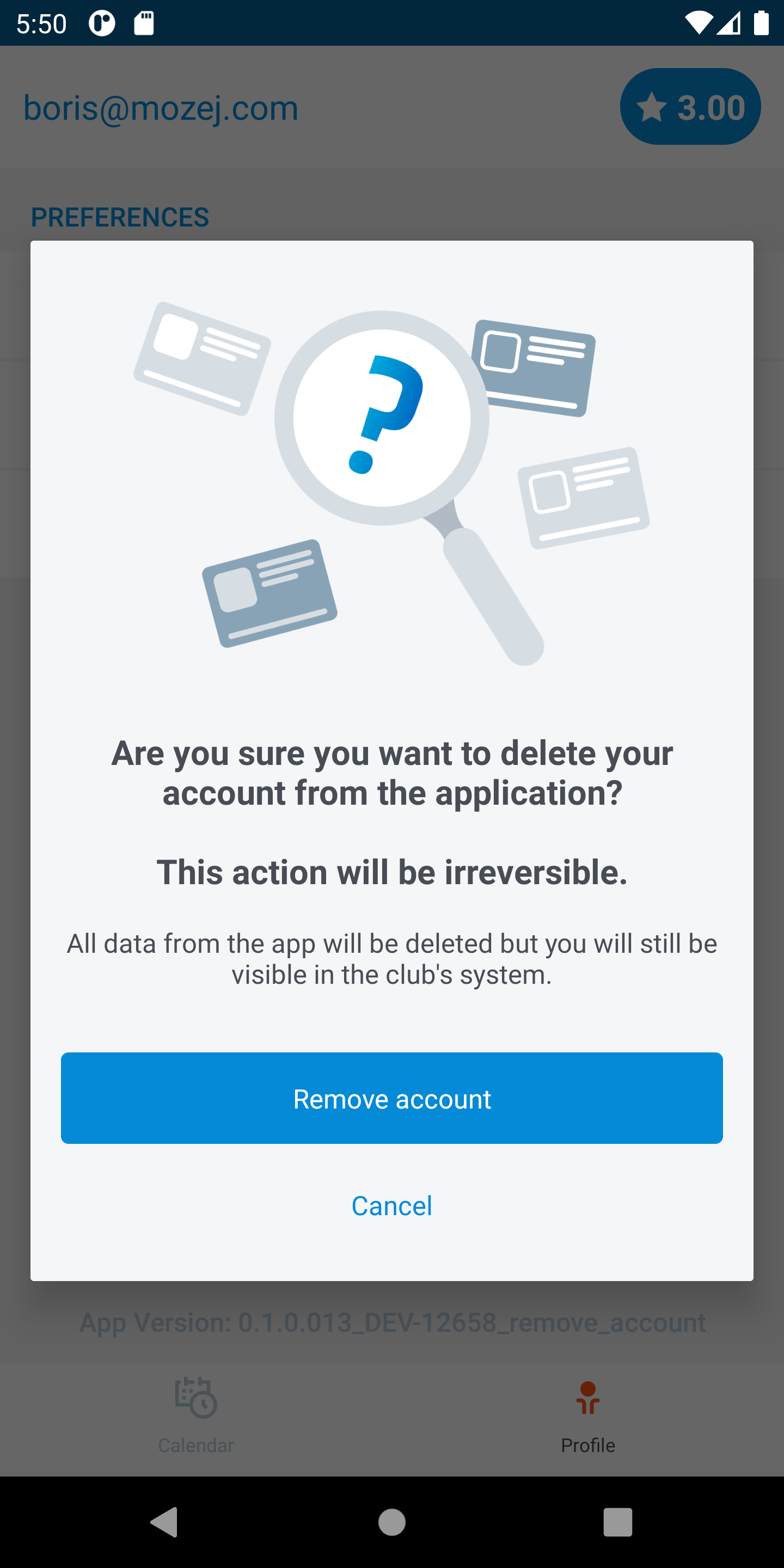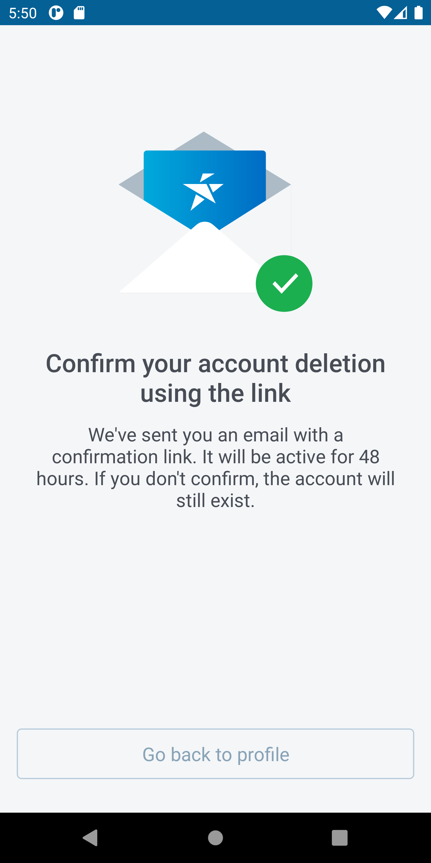 5. Tap on Remove account and mobile application will send an email with confirmation link.