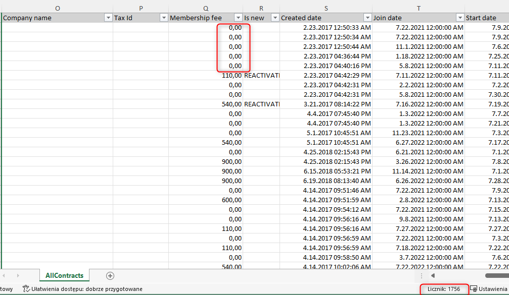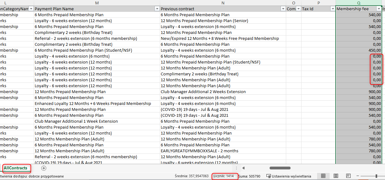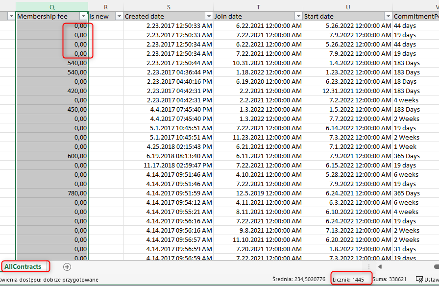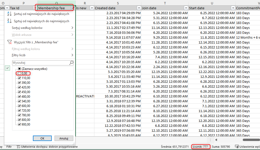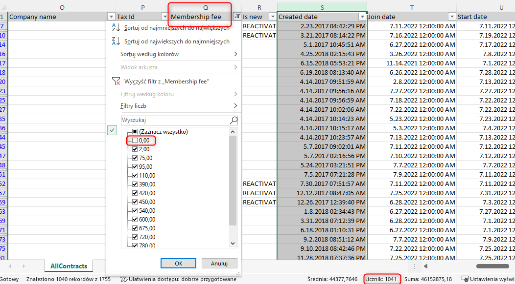 5. Now, go to column Q and filter out 0 membership fee contracts as it is presented on the screen below.