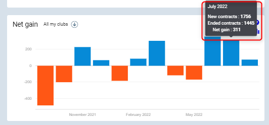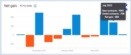 According to the displayed information, there were 758 contracts ended in July and 1041 signed. This version of the widget does not include free payment plans.