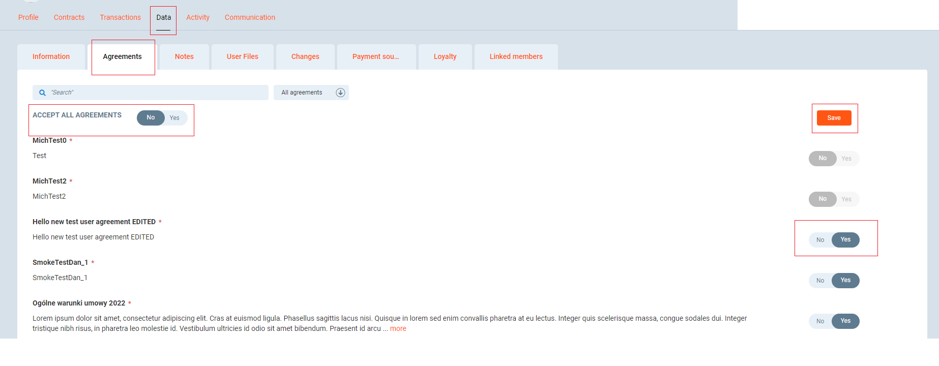 - YES/NO - this toggle allows you to change consent to an individual agreement. If such an agreement does not have Visible selected in the PGM system, it will still be visible in this tab, however it will be disabled and you will not be able to edit it here.