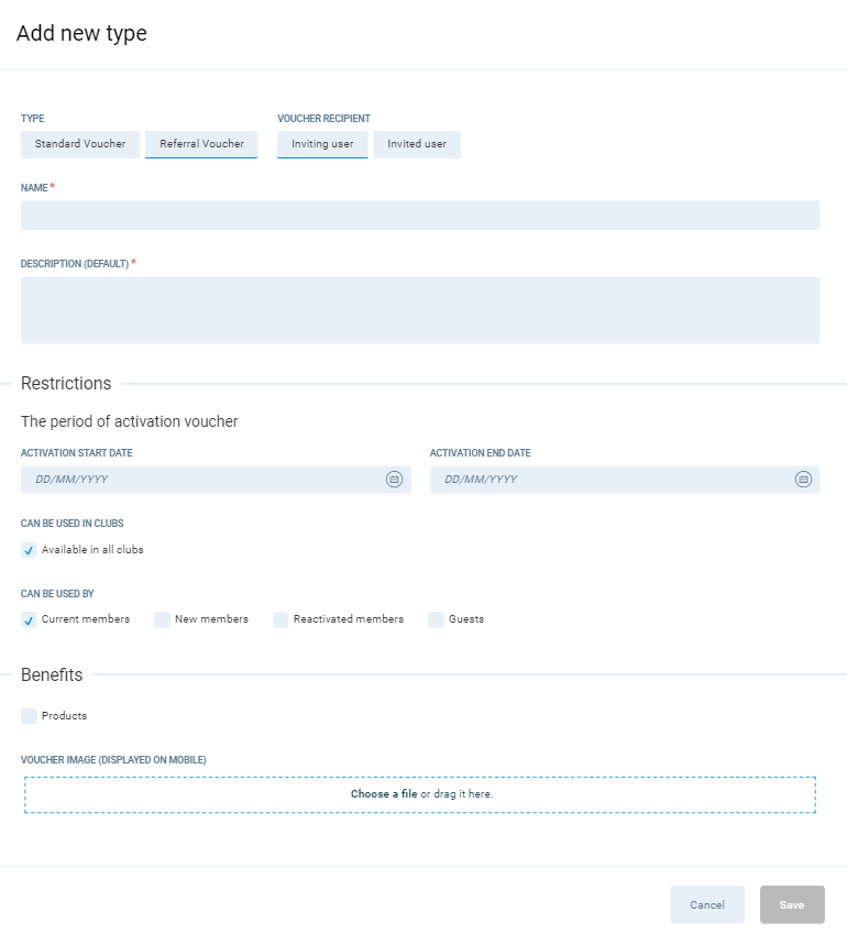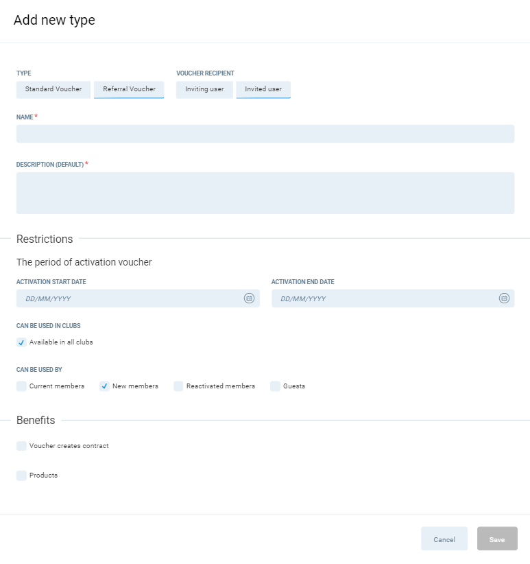 Referral Voucher is a unique type of voucher used when creating referral campaigns for your club members and guests. There are various scenarios according to which you can award invited people or the members and guests that invite them with different Benefits. Go the list of Use Cases in Hints to see the most popular options.