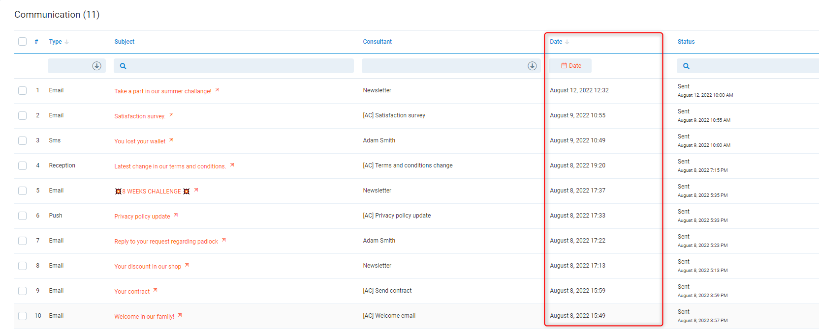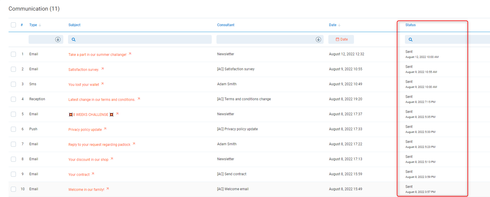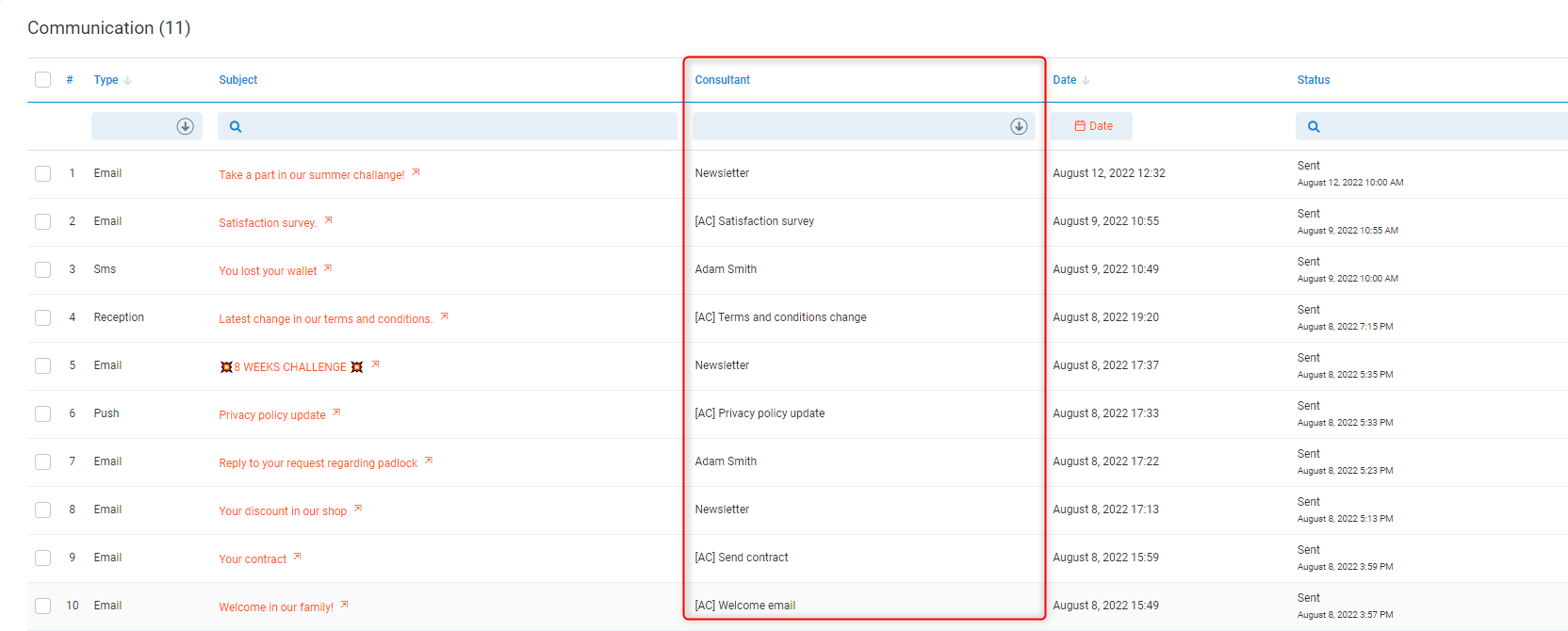 - Consultant - displays the results depending on the creator of communication. It shows which employee or what functionality was responsible for sending the selected communication (for example: Newsletter, Automation, Employee). In the grey box above you can select an available consultant and filter results to this value.