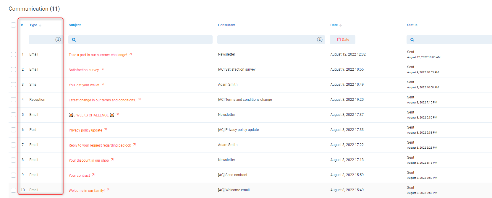 - Type - displays the results depending on the source of communication. It shows the channel through which the notification was sent (for example: Email, SMS, Push, Post, Phone, Meeting, Task, Reception). By clicking on the grey box above, you can select one or more sources of communication and filter the results to this value.