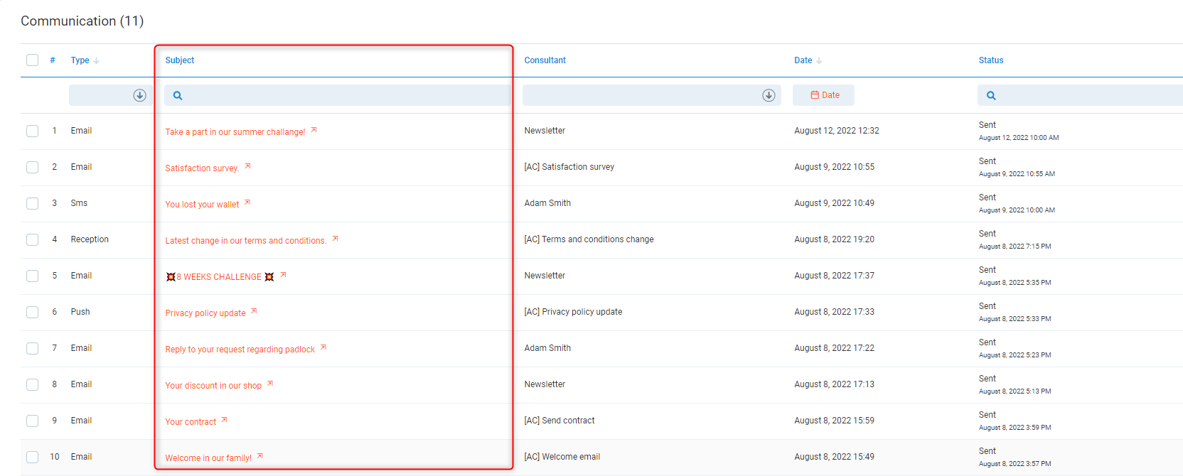 - Subject - displays the results based on the topic of communication selected during the process of creating a notification. It can shortly explain what was the notification about. In the grey box above, you can type the selected words and check if there are any subjects that match your needs.