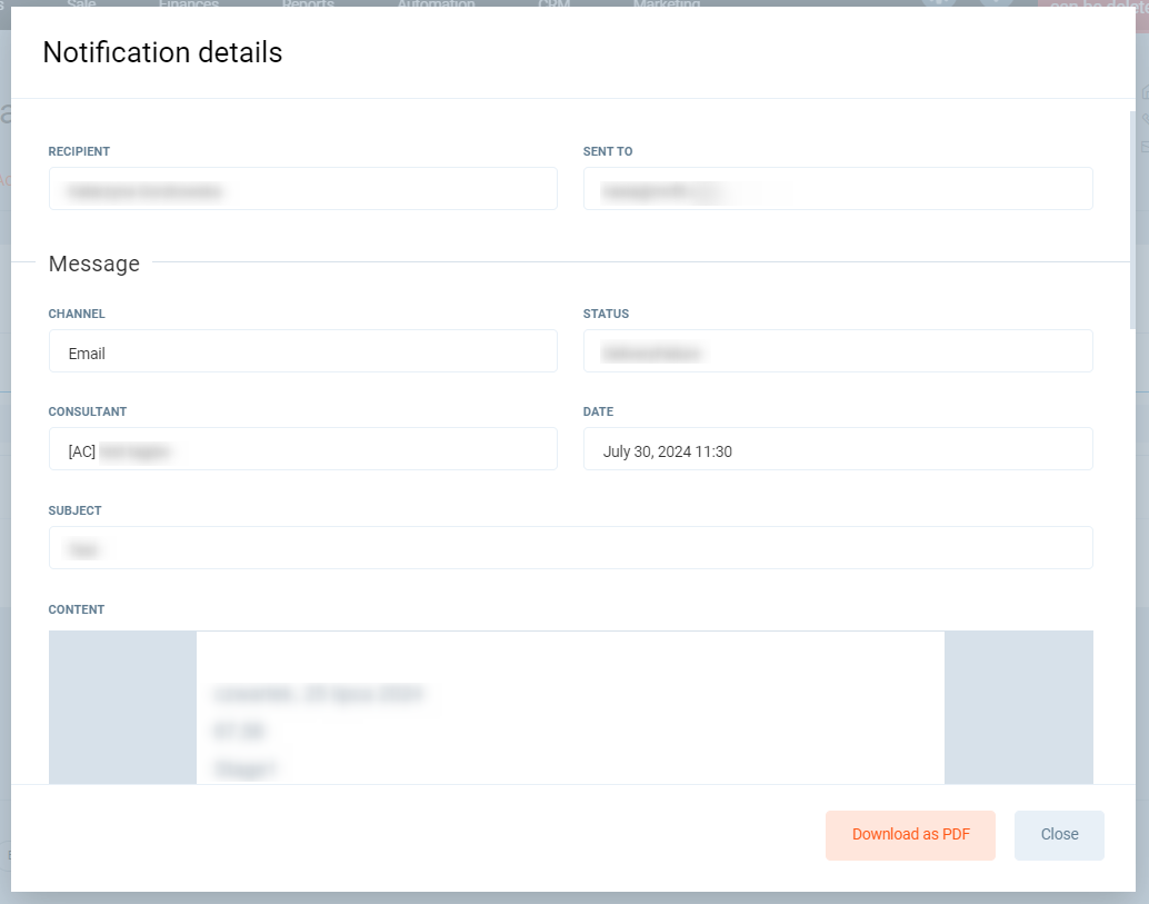 Click on the orange text in the subject section to display the content of the notification or newsletter. You will also find the option to download the file to your device by clicking the Download as PDF button.