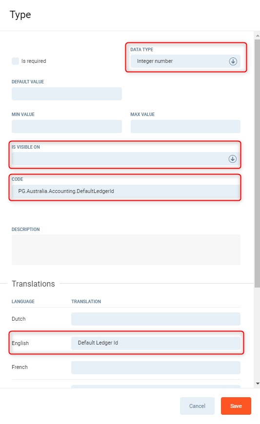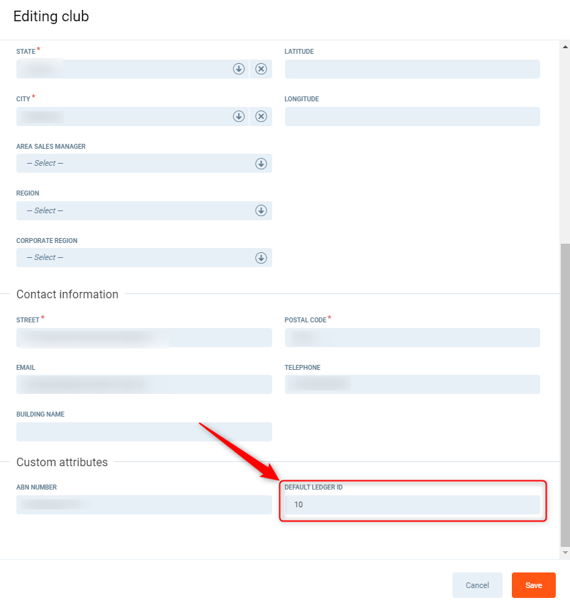Scroll down to the bottom of the pop up window to display the Default Ledger Id field created, add in the value from the report. Press Save.