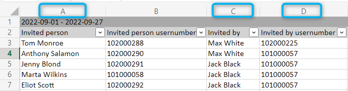 Column C - Invited by - this is the name and surname of the Inviting user, meaning the member who referred a friend to the club.