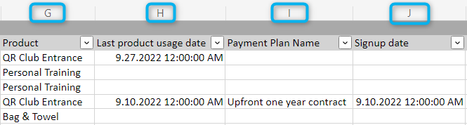 Column H - Last product usage date - this is the date when the Invited person used the Product, i.e. entered the club for free or had their Personal Training session.