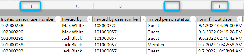 Column E - Invited person status - the status indicates if the Invited user is a Guest (they don't have any Contract) or a Member (they have a Contract).