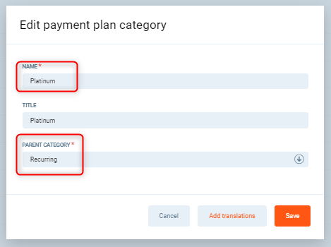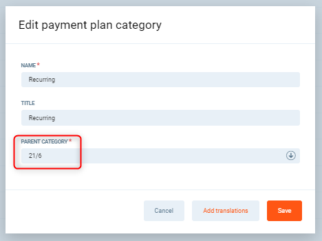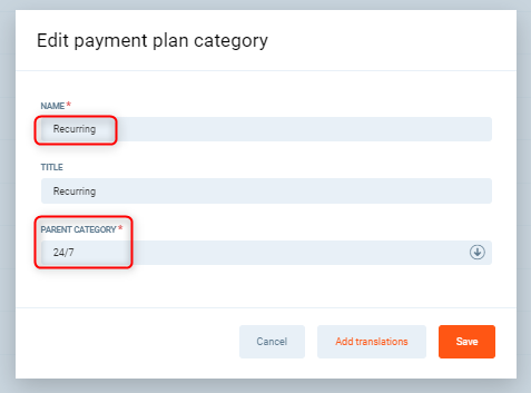 Steps: Click Add payment plan category. In the Name field, enter "Seasonal". Leave the Parent category dropdown as-is. Click Save.