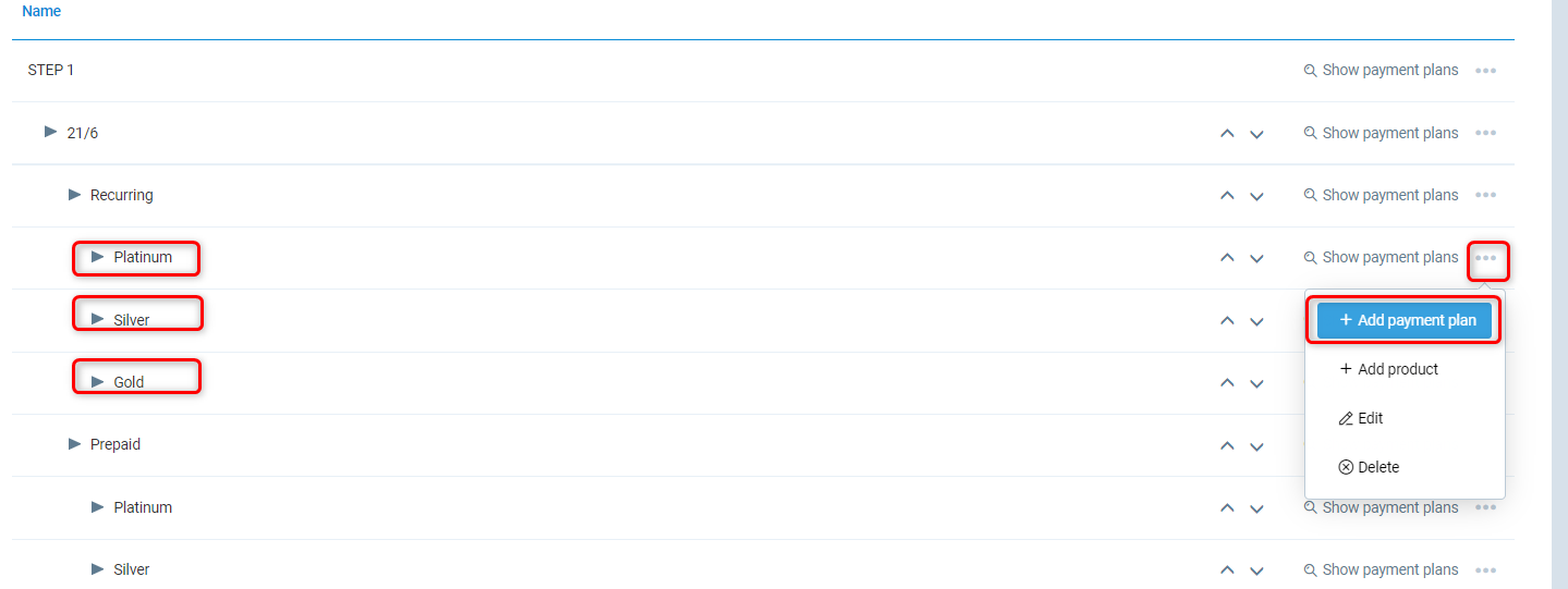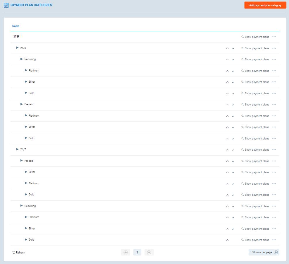 As this is the last subcategory level, it's time to Add Payment Plans. You need to add them to bottom subcategories. In order to do that simply click three dots on the right side and click Add Payment Plans.