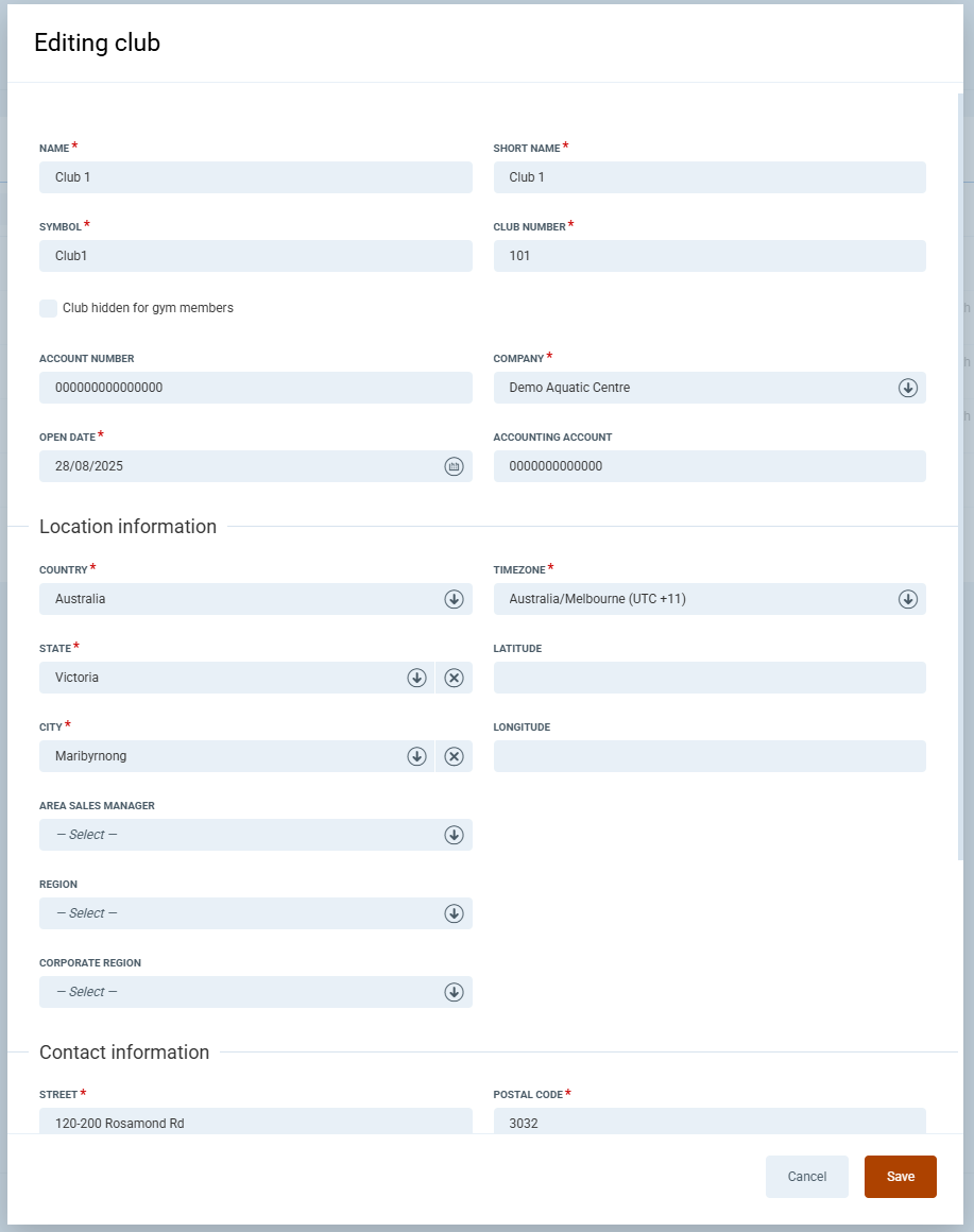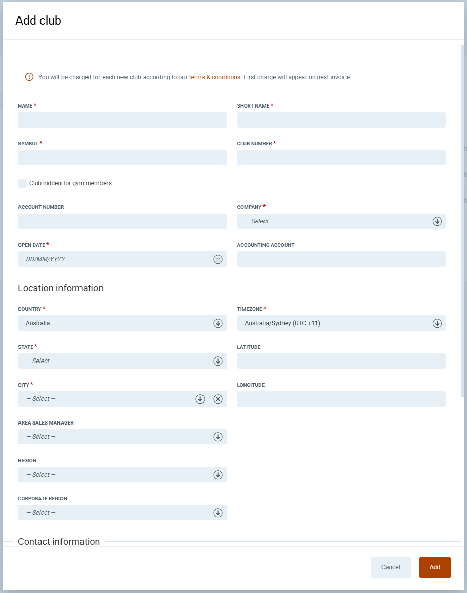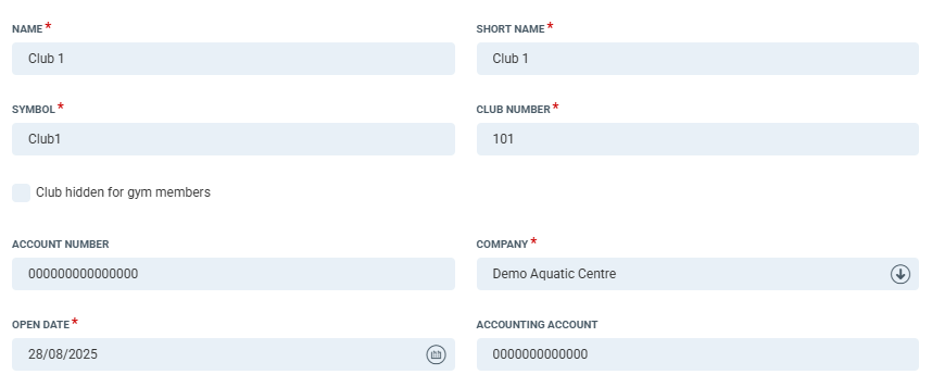 Steps/Settings: Click Add club. Fill in the required Name and Company details. In the Open date field, select the future date on which the club will officially open. Click Add.