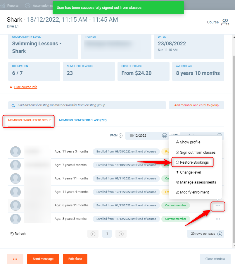 On the class screen, press the three dots next to the club member name and press the new option Restore booking.
