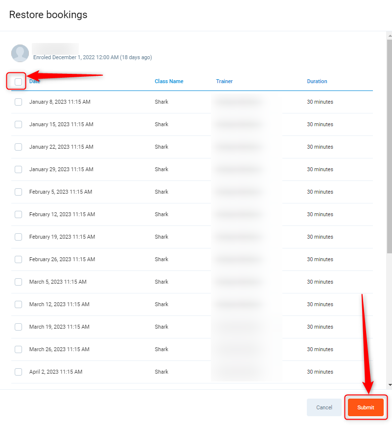 Press the tick box to the left of the date field, this will select all future classes to restore, press Submit.