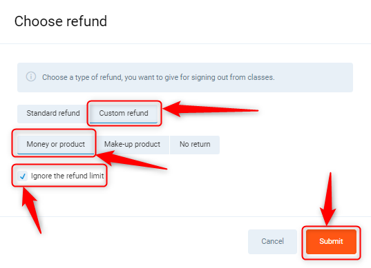 Select Custom refund, then Money or product, ensure Ignore the refund limit is ticked, then press Submit.