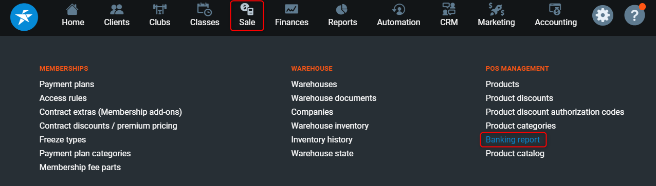 1. Go to the PGM -> Sale -> POS Management -> Banking report.