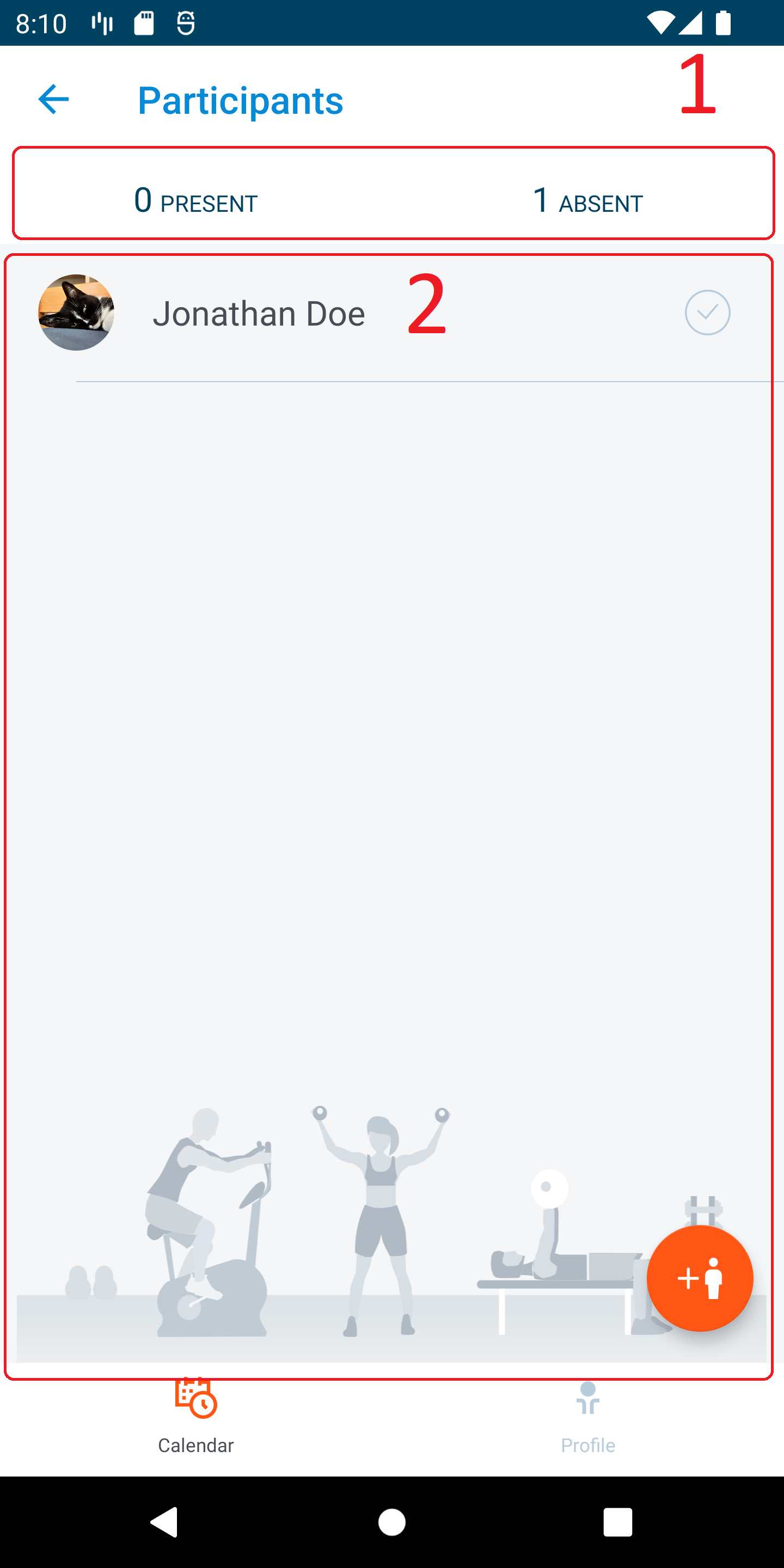 3. On Participants screen you will see number of present and absent club members (1) and list of enrolled members (2)
