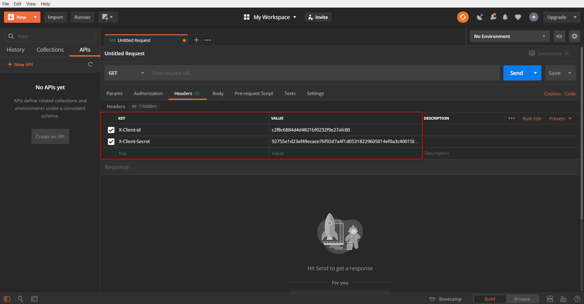 1. Go to the Postman and paste your Client-Id and Client-Secret in the Headers tab. You need to write it in the key as X-Client-id and X-Client-Secret (see screenshot below). Now, you are ready to send a request to API.